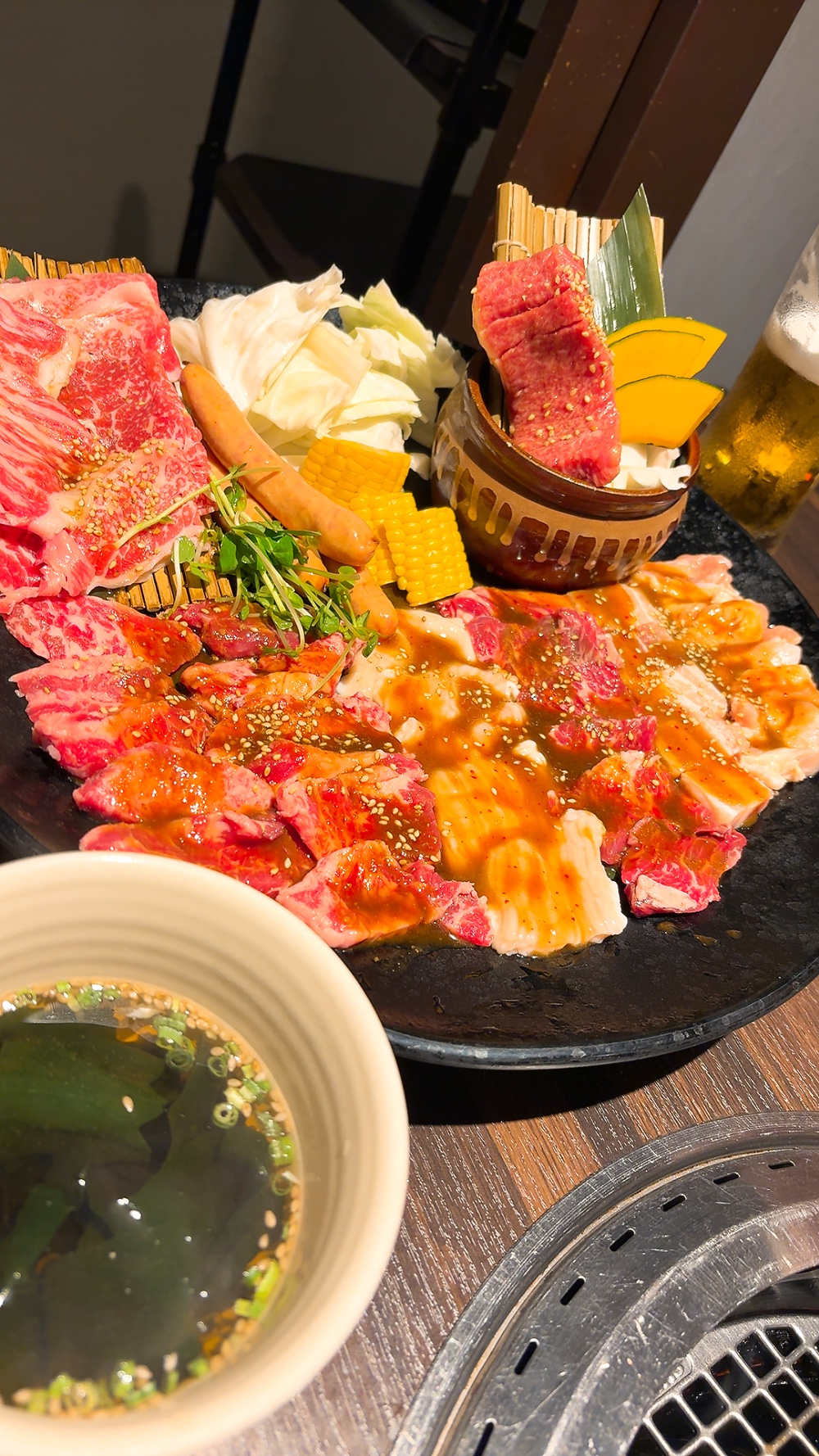 私たちが注文したセットは、大皿に美しく盛り付けられたお肉が登場し、その豪華さにテーブルが華やぎました。