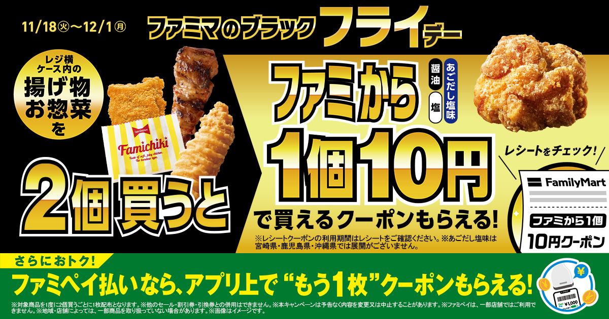 | 📝 基本ルール | 対象の揚げ物・お惣菜を一度に2個購入するごとに、「ファミから1個10円クーポン」がレシートに1枚印字される。 |