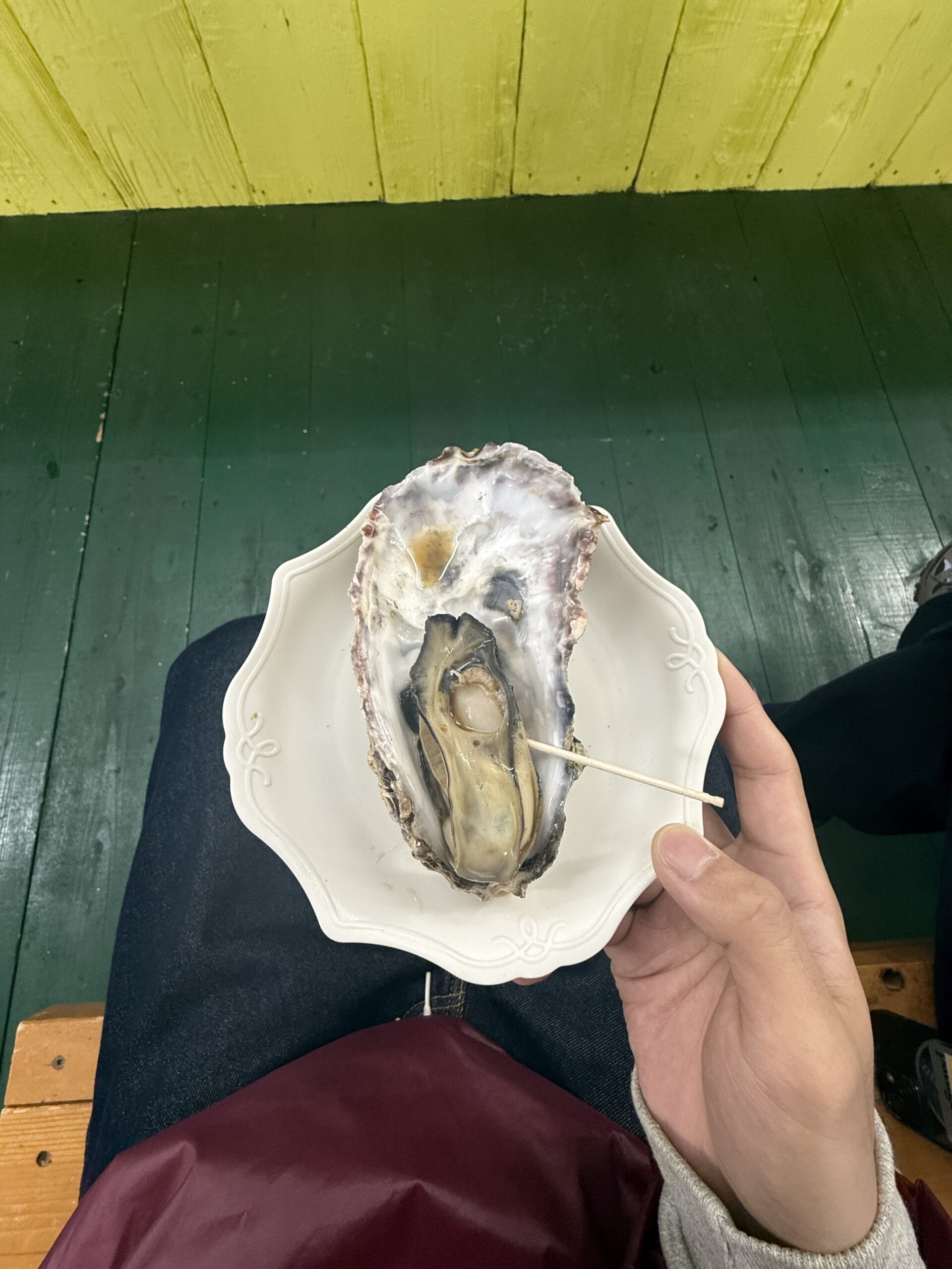 朝一でほぼ1番のお客さんだったということで店員さんからこの日で1番大きい牡蠣をいただきました!