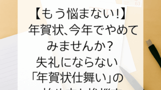 スタッフ日誌 【もう悩まない!】年賀状、今年でやめてみませんか?失礼にならない「年賀状仕舞い」の始め方と挨拶文 本日もご訪問ありがとうございます!すっかり秋めいてきて、コンビニにはおでんが並び始めましたね🍢。秋の夜長、皆様いかがお過ごしでしょうか??さて、秋が深まるということは・・・そう、年末が近づいてきているということ。。。年末といえば、大掃除、ク... スタッフ日誌